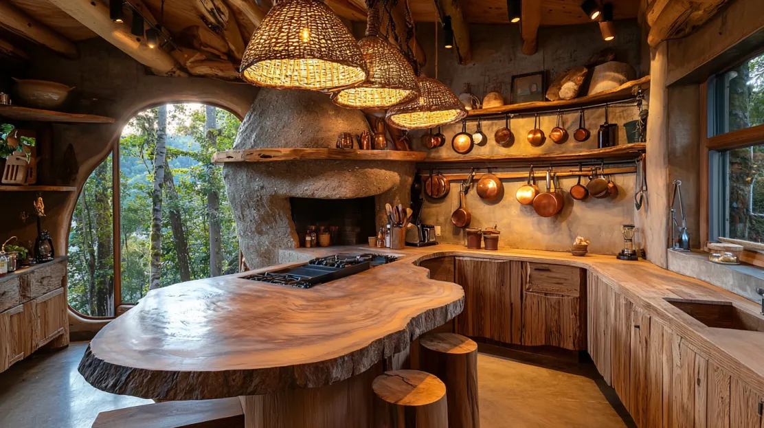 The kitchen in the Tiger Forest Home is a perfect blend of rustic charm and practical design, offering a warm and inviting space for culinary activities. Without any windows, the room creates an intimate atmosphere, accentuated by the glow of soft pendant lights with woven shades. Polished stone countertops provide both elegance and durability, while hand-hewn wooden cabinets with visible natural grains add an earthy touch. Every detail—from the texture of the wood to the smooth finish of the stone—has been carefully chosen to reflect the home’s connection to the natural world.