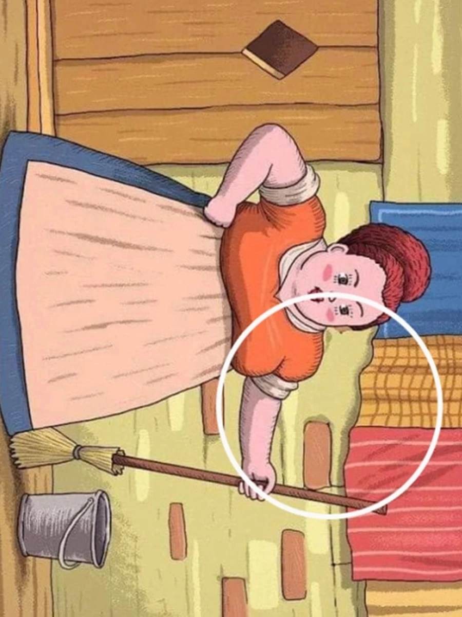 If you rotate the image, you’ll see the silhouette of a cat on the wall between the woman’s head and the top of her broomstick.