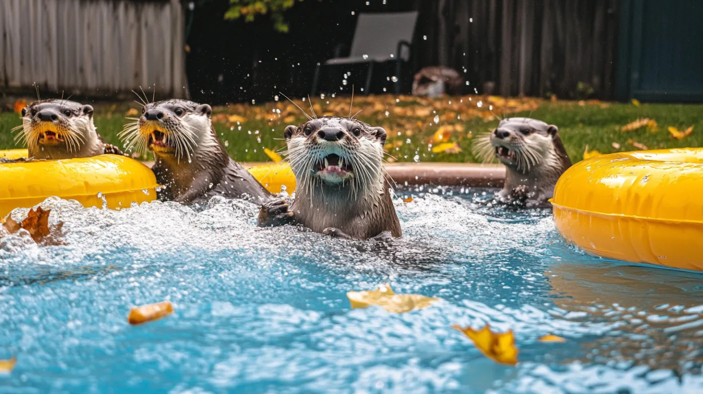 The pool, usually calm and pristine, was now a blur of ripples and splashes. Pool floats were overturned, potted plants nearby were soaked, and the surface was littered with leaves and shredded flowers.